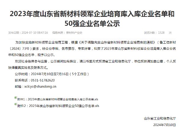 近日,公司憑借在新材料領域的創(chuàng)新實力及市場競爭力,通過嚴格評審脫穎而出,成功入選2023年山東省新材料領軍企業(yè)培育庫。